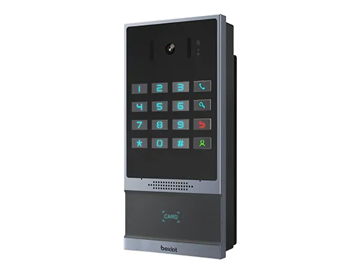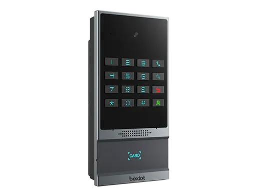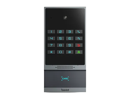 支持多种开门方式:密码、RFID/IC卡、室内开关、DTMF远程开门、NFC、定时开门 •轻奢品级智造工艺铝合金边框,大气全键盘机械按键 •200W像素广角摄像头(水平120度,垂直60度),支持夜视功能 •内置3路短路输入和2路短路输出接口,Line Out接口可连接助听辅助设备 •内置TF卡槽,最高支持128G,可用于图片存储 •实现高品质双向免提通话