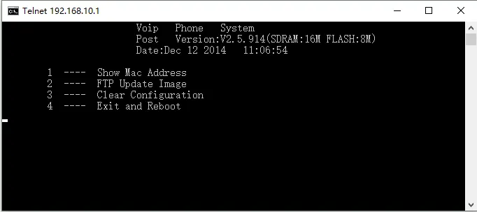 在升级成功之后,在 POST 命令行界面,执行 3 就会清除配置(在恢复出厂设置时一定保持话机通电,不能断电)之后,执行 4 就会重启话机。