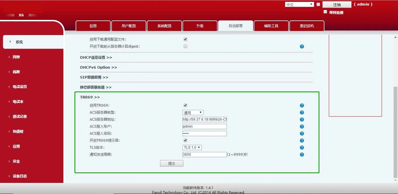 话机默认状态下 TR-069 选项是没有开启的,用户可以直接登陆设备的 web 网页进行配置, 下面以话机 X6 为例进行配置。